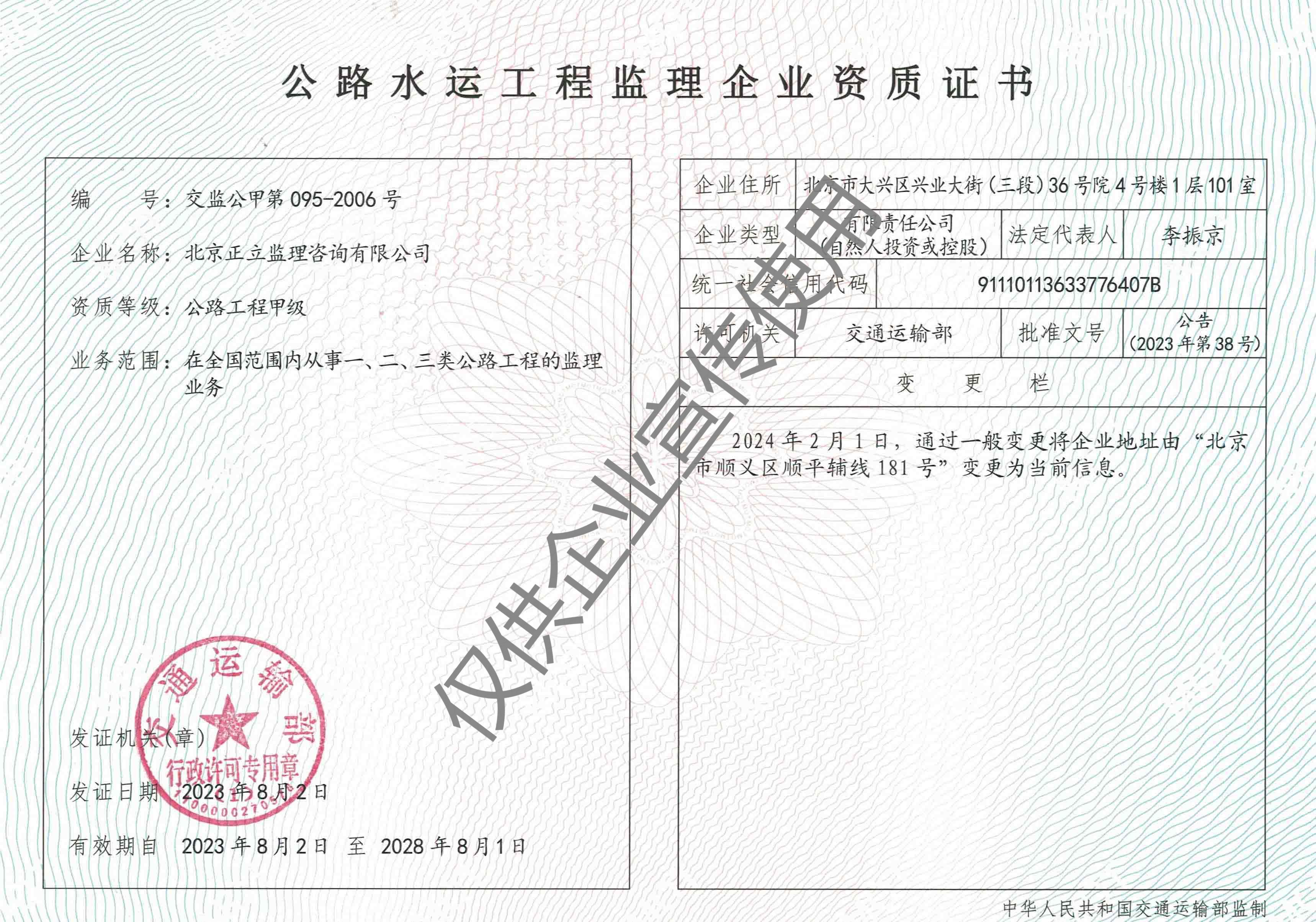 北京正立監理咨詢有限公司成立于1998年7月1日,其前身隸屬于北京市公路質量監理站。具有獨立法人資格,是獨立核算、自負盈虧的經濟實體。企業經營范圍:公路工程監理、交通工程監理、市政公用工程建設監理、工業與民用建筑工程監理、工程監理咨詢、技術咨詢、技術培訓等。